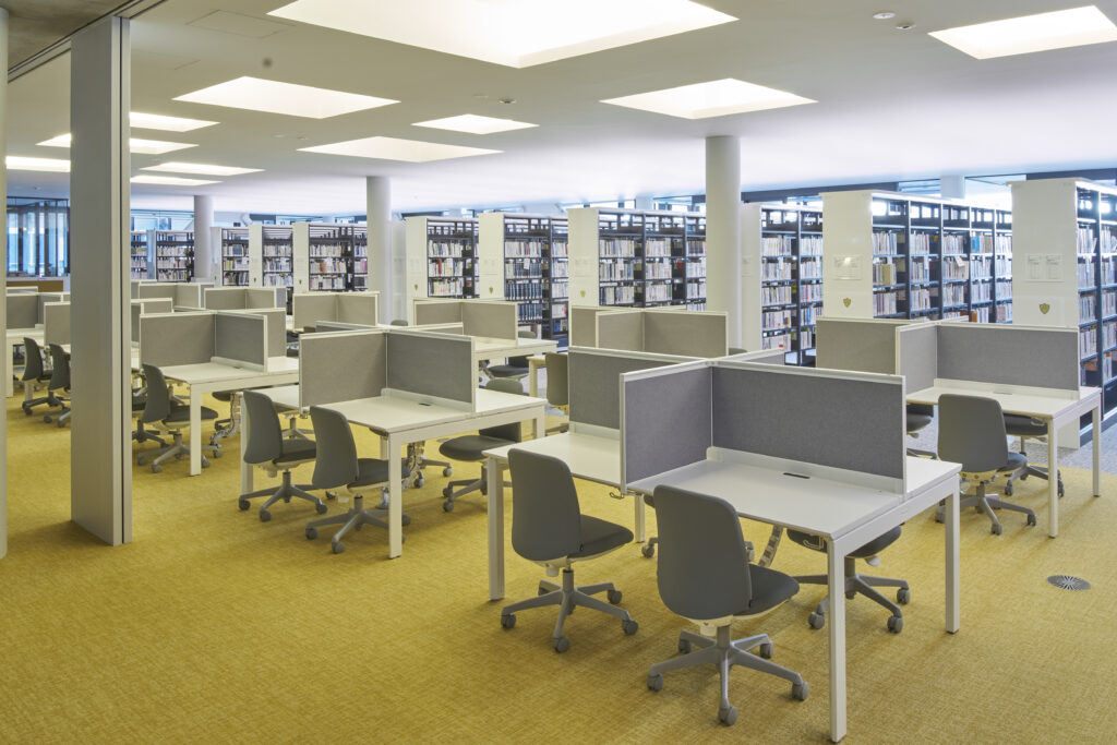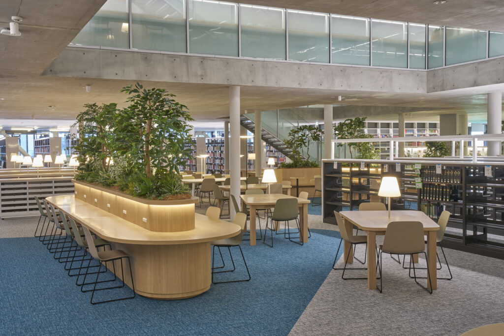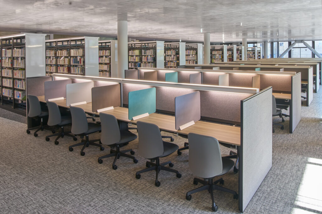 4階は、家具の色調を抑えて静かな雰囲気を演出しており、会話が禁止されているため、個人での作業に集中しやすい環境です。広めのテーブルも設置され、会話はできないものの、友人と並んで学習することが可能です。また、書架の間隔は車椅子が通行できる128cmを確保し、バリアフリーにも配慮した設計となっています。