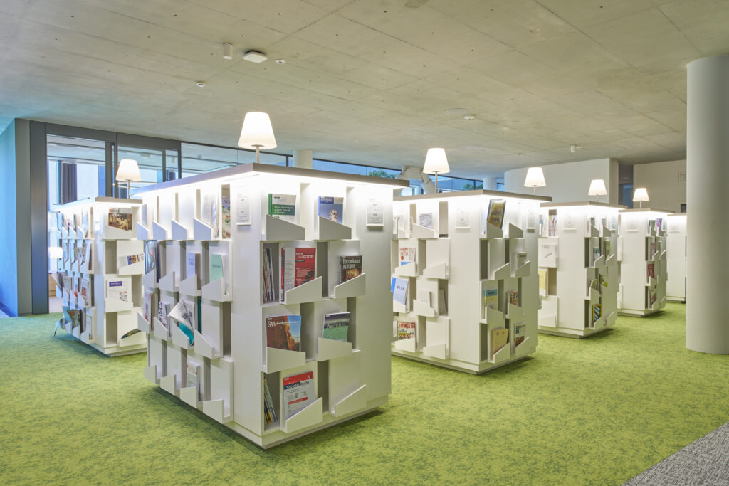 2階の閲覧スペースはディスカッションが可能となっており、複数名で使えるように広めのテーブルを設けています。また、雑誌の書架は上下で互い違いになっており、デザイン性と運用の利便性のどちらも叶えたつくりにしています。