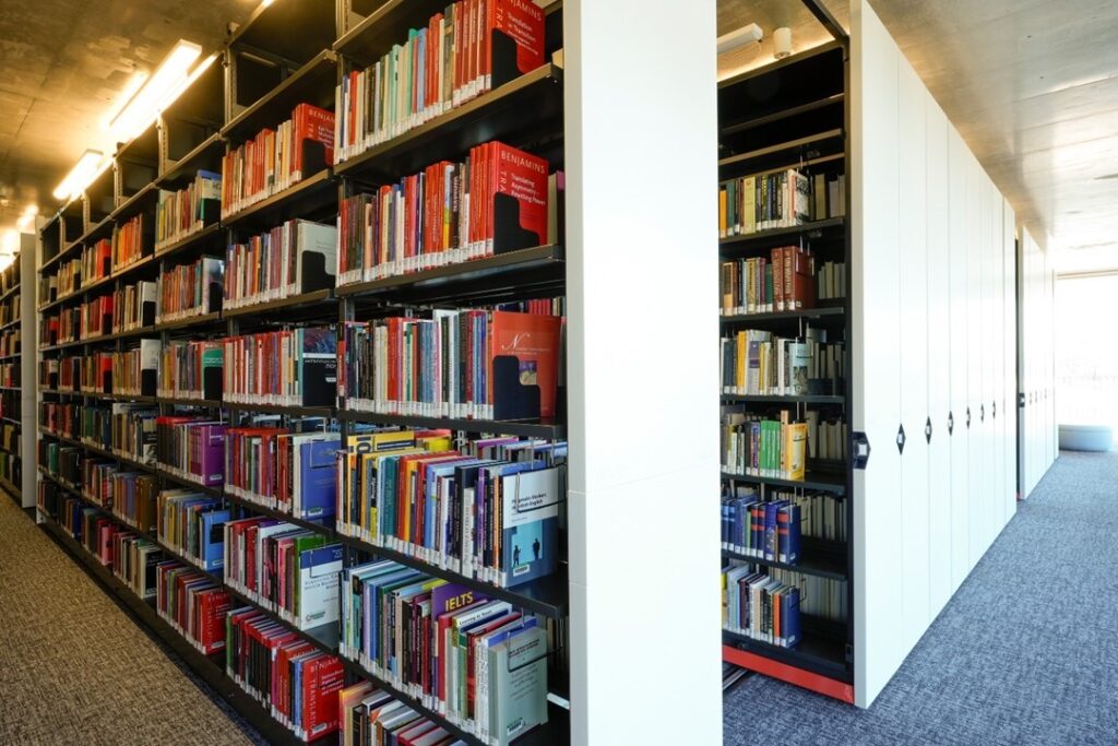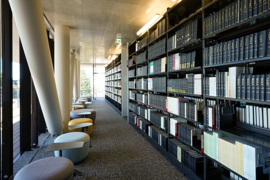 5階には電動式集密書架を導入し、約20万冊を収蔵可能なスペースを確保しています。和文・欧文を含む各種専門誌や他大学の紀要が整然と配架されており、学生が十分に情報収集できる環境を整えています。