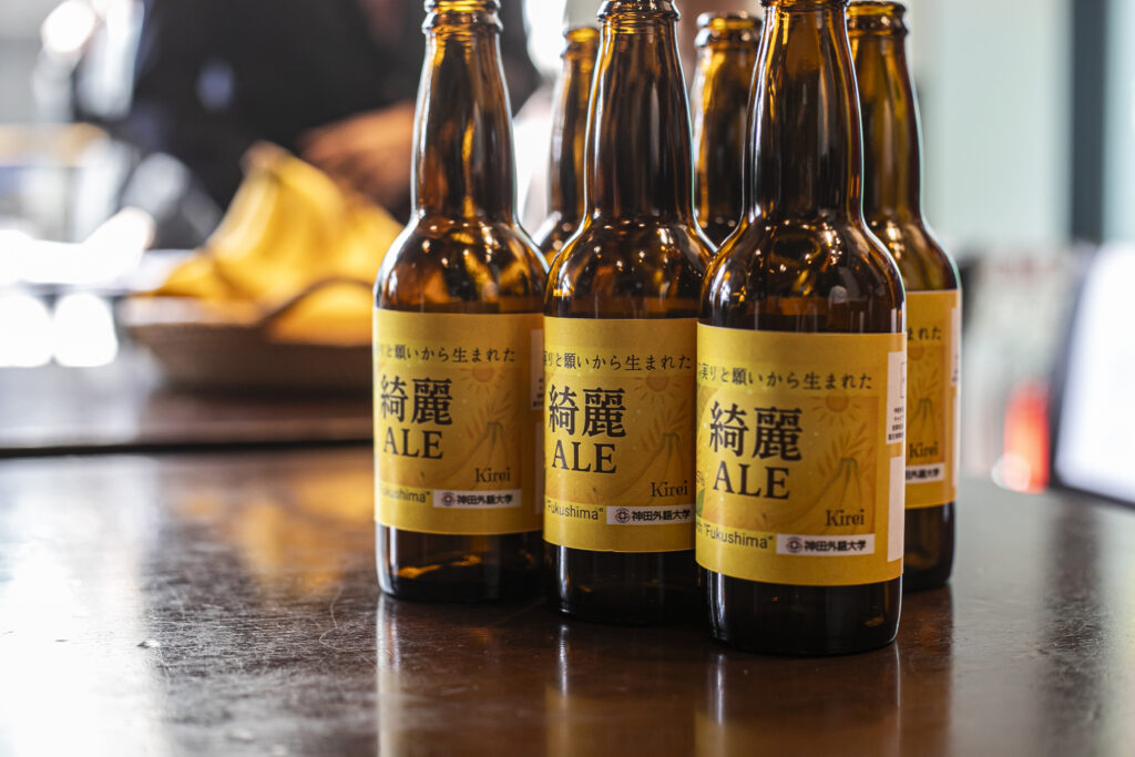 さまざまな出会いと思いが育まれ、2025年11月19日、HANEDA SKY BREWINGにて、震災復興ビールの仕込み式が開催されました。「福島の実りと願いから生まれた 綺麗ALE」と名付けられ、ラベルには英語で「Rise with “Fukushima”」(福島とともに立ちあがろう)というメッセージが添えられました。広野町から見える海の朝陽を希望の光に見立てたラベルも学生たちの発案から生まれました。