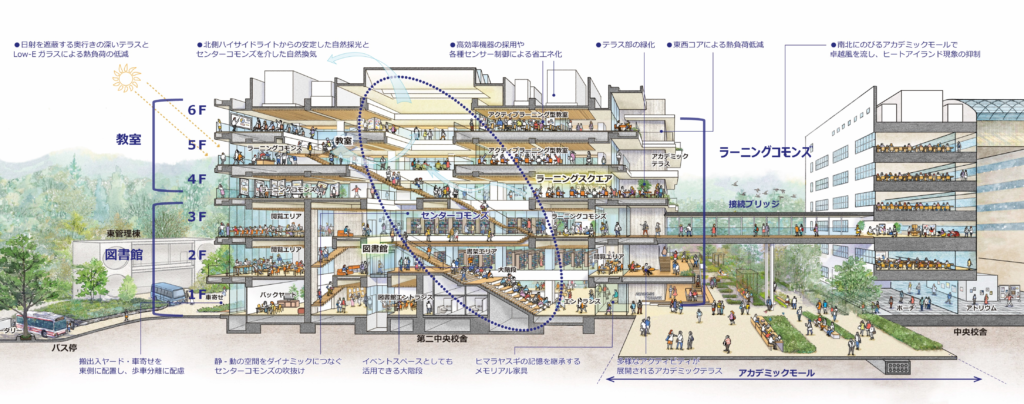 従来の教室棟・図書館がそれぞれ分かれた棟ではなく、一体となった「多様な学び場」として、目を引くものがあります。