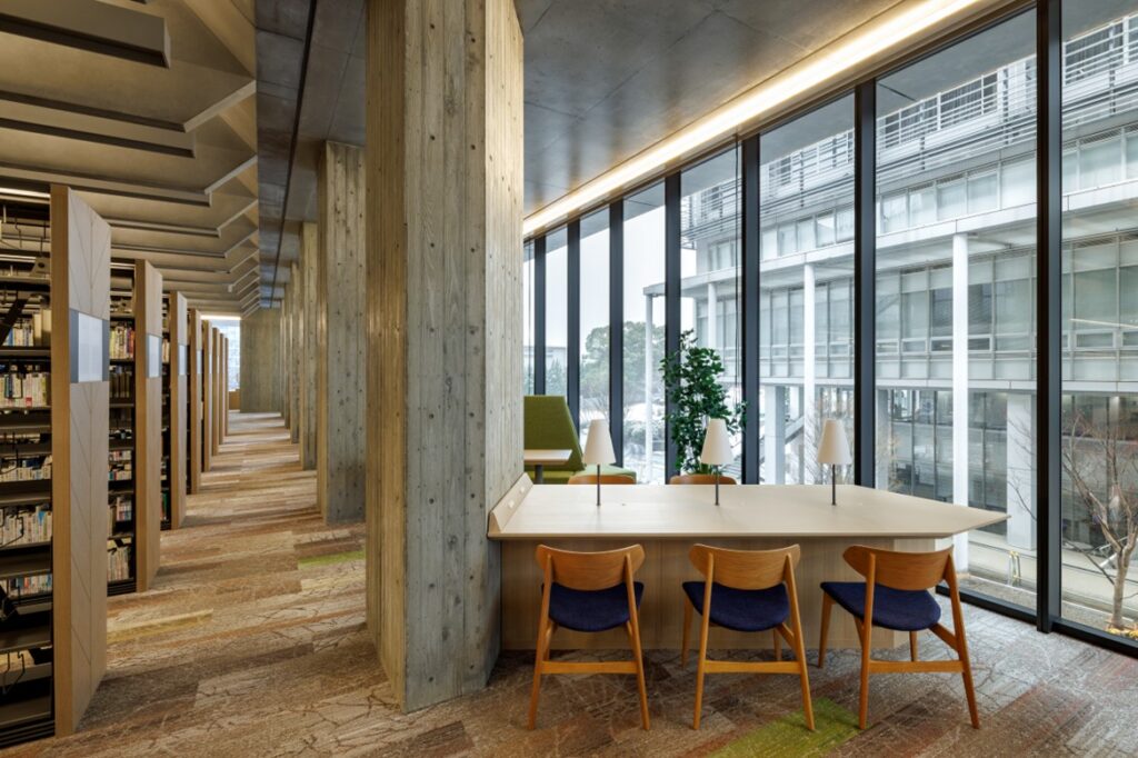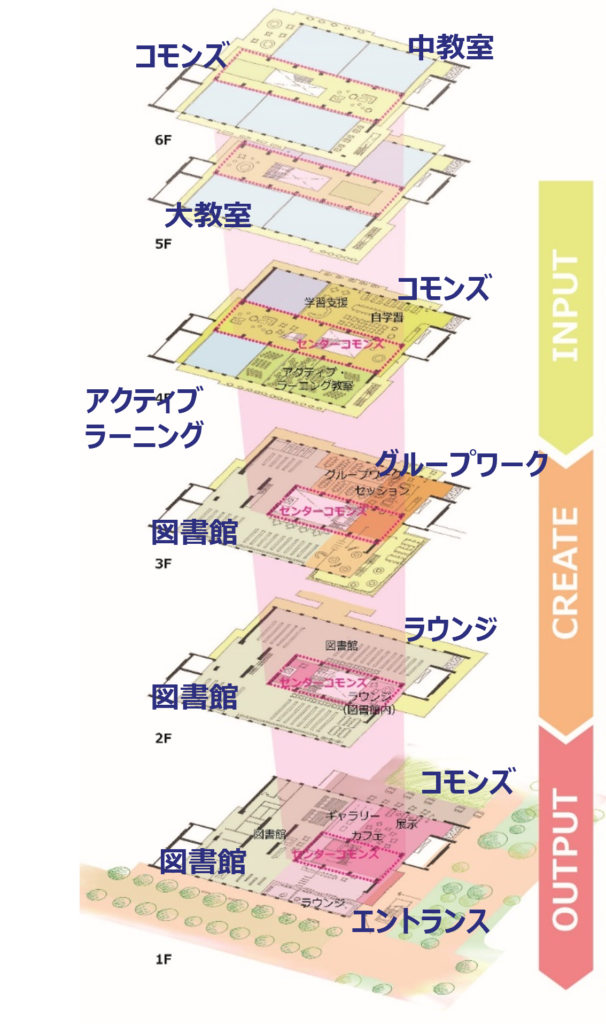 1階から3階が図書館エリア、4階から6階が教室フロアとなっており、建物全体にラーニングコモンズが展開されています。