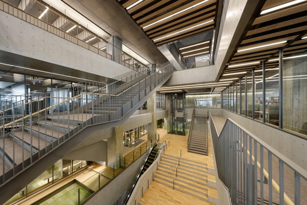 センターコモンズは偶然の出会いや、学生同士の交流、自主的な学びが促される設計となっています。階段に座って話したり、すれ違う人と自然なコミュニケーションが生まれている様子が目に浮かんできます。